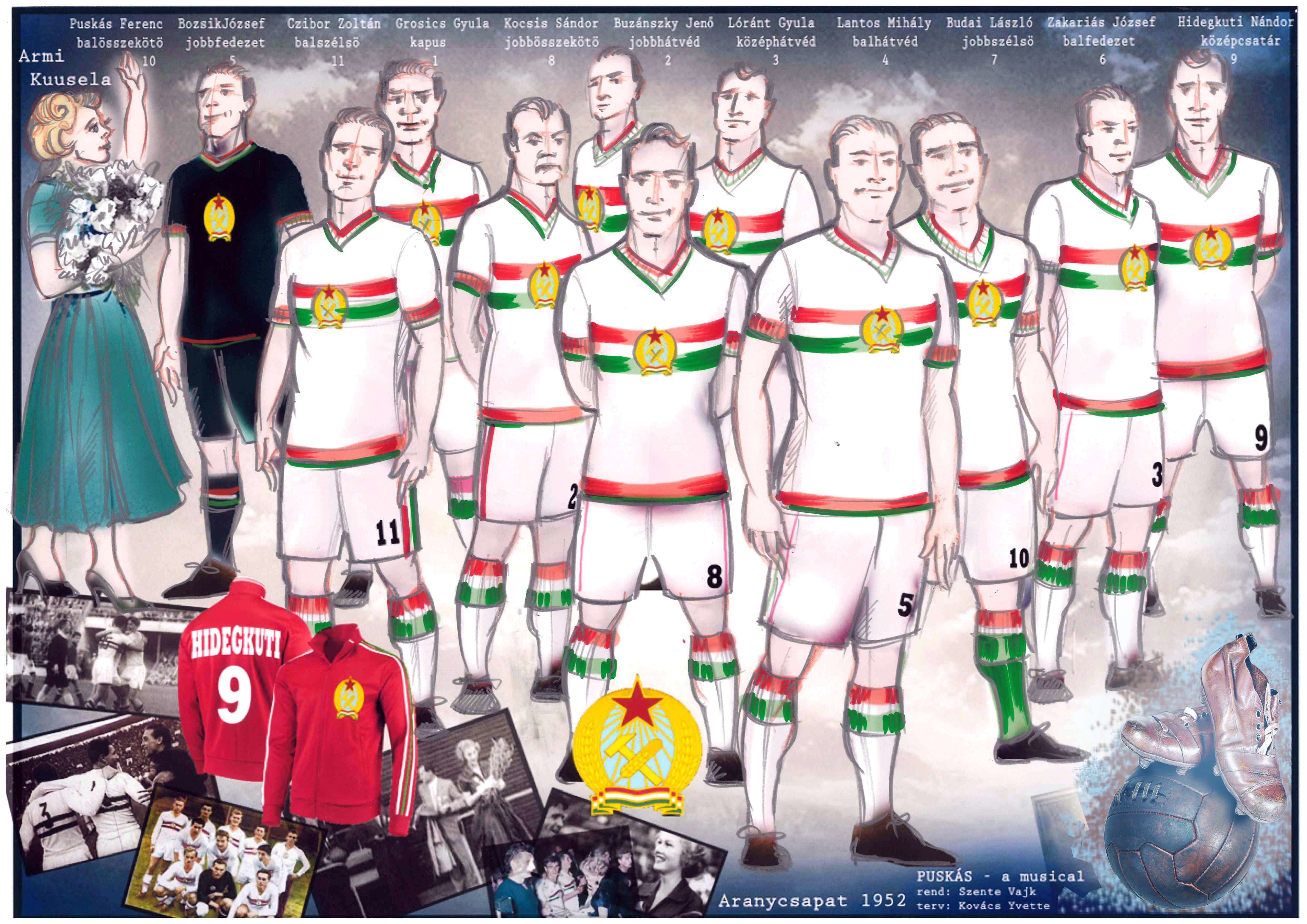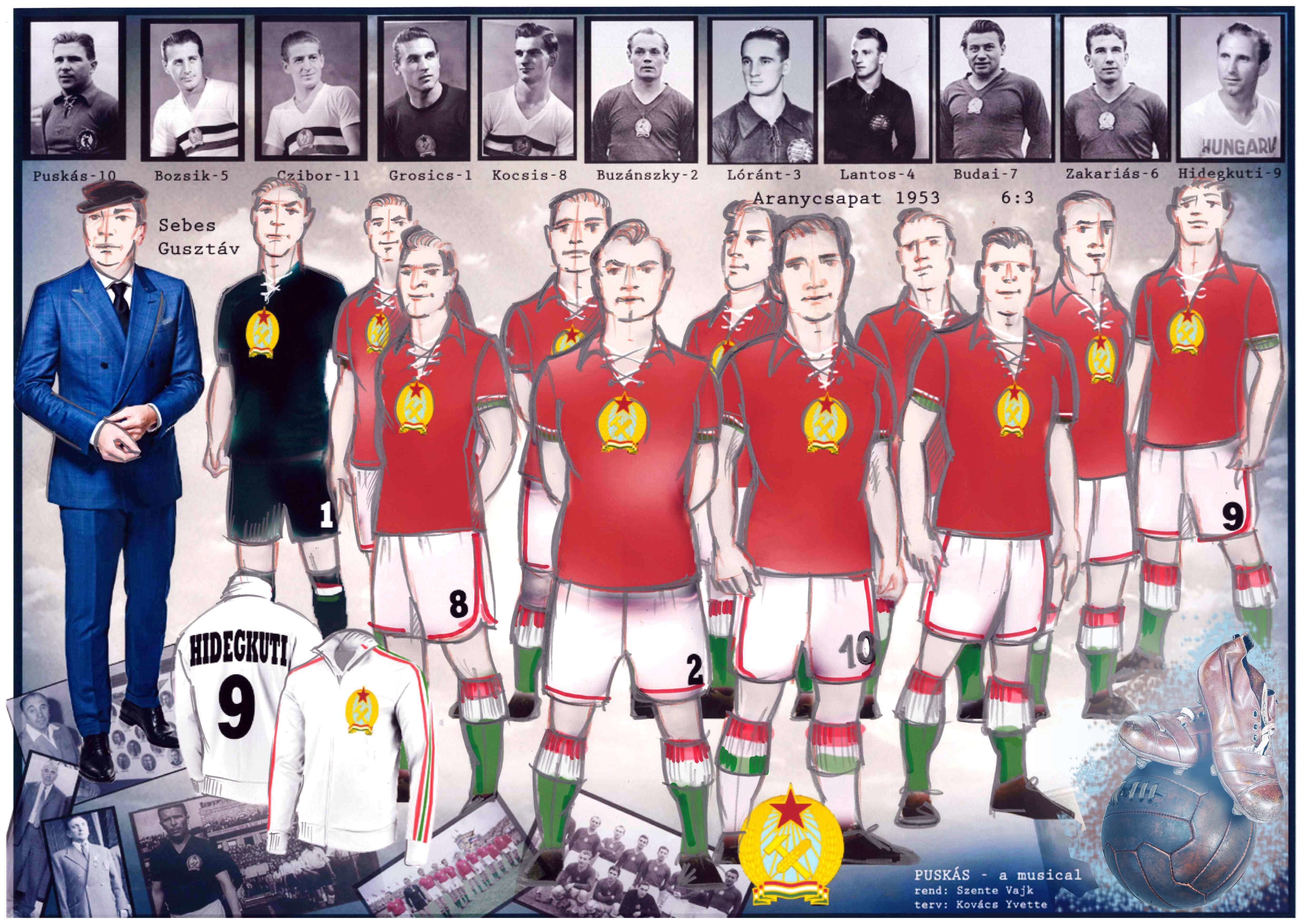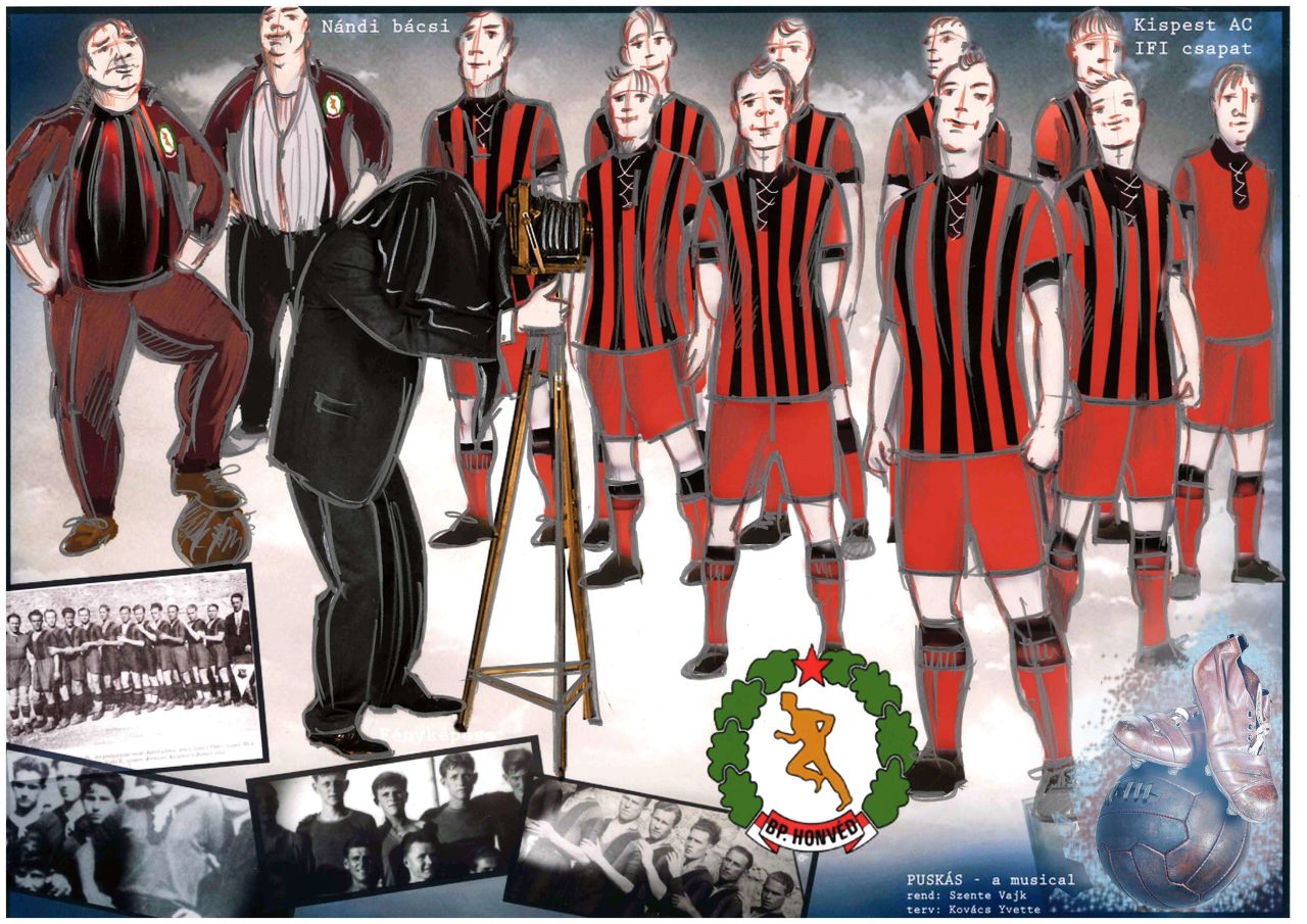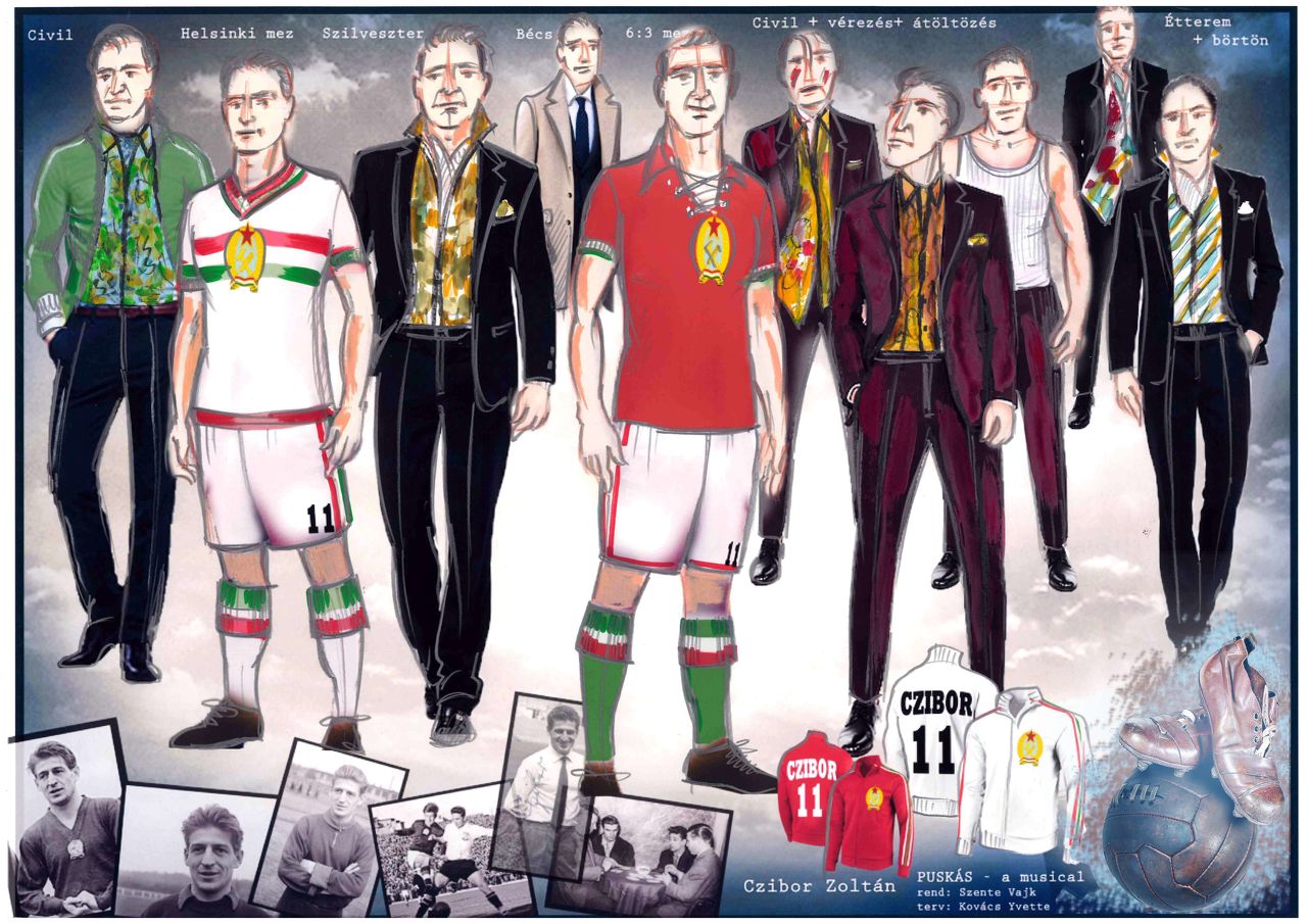 A Puskás Ferencről és az Aranycsapatról szóló musical szereplőinek jelmeztervezése többszörösen kreatív feladat volt. A kor divatjának megjelenítése (1930-1950-es évek), mégis a formák, szabások és anyagok mai átértékelése jelentette a főbb irányvonalat. Az előadásban felvonuló közel százfős szereplőgárda mindegyike többször öltözik, ezért a jelmezek mennyisége önmagában hatalmas munkát igényelt. A színészek két személy kivételével létező személyt jelenítenek meg, a szereplők tehát valós személyek, akik külön szokásokat, ízlést és öltözeteket tudnak maguk mögött. A fennmaradt képi anyagokat is tanulmányozva alkottuk meg a terveket, hogy az egykori személyiségekhez illően, a finom részleteket is figyelembe véve a nézők felismerjék a karaktereket. A darab elengedhetetlen része, hogy jellegzetes öltözékük alapján felismerjék és megismerjék az akkori ruházatuk alapján az Aranycsapat, a külföldi csapatok tagjait, a politikusokat, az akkori rendszer és hatalom kiszolgálóit. A darabban felvonultatott mezek tervezése, és korhű mégis modern megjelenítése az egyik legizgalmasabb időutazás, alapjául az adott csapatok szín- és motívumvilága szolgált, a minőség és a forma viszont a mai sztárfutballisták öltözeteit idézi.